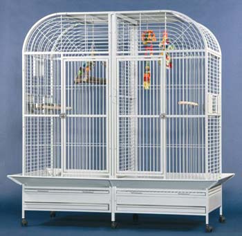 Ruime kooi met een verwijderbaar tussenschot, 4 naar buiten draaiende rvs voerbakken, 2 zitstokken, 2 roosters, opvangbakken, opvangplaten, wielen. Een deur voor een nestblok buiten de kooi, 2 aanvlieg kleppen boven de deuren 137x81x185 cm, 145 cm binnenhoogte, 2,5 cm spijlafstand en 4mm spijlen, 106 kg. Voorzien van een poedercoating: zeer hard en gifvrij. Merk: Montana