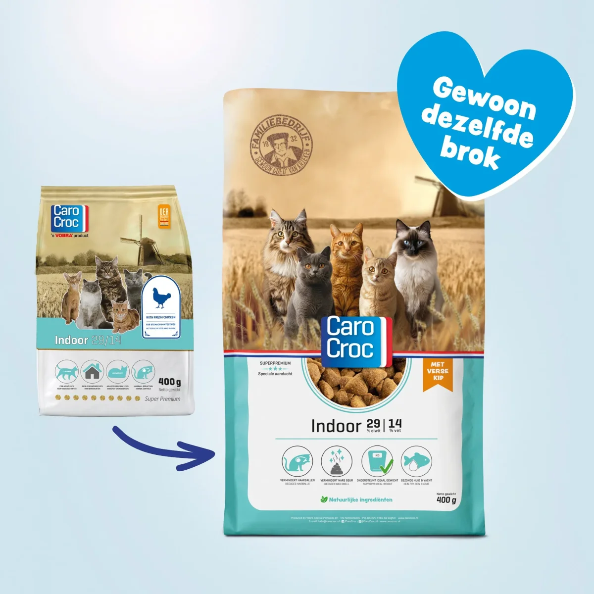 - Volwassen katten die voornamelijk binnenshuis wonen hebben specifieke behoeften en bewegen minder dan kan die ook buiten komen. Speciaal voor deze huiskatten is CaroCroc Indoor ontwikkeld en bevat een verlaagd energiegehalte. De toevoeging van natuurlijke vezels in CaroCroc Indoor helpt de vorming van haarballen te verminderen en het toegevoegde zalmolie ondersteunt de huid- en vachtconditie. Daarnaast bevat CaroCroc Indoor extracten van de yucca plant die bijdragen om de geur van de ontlasting te verminderen.