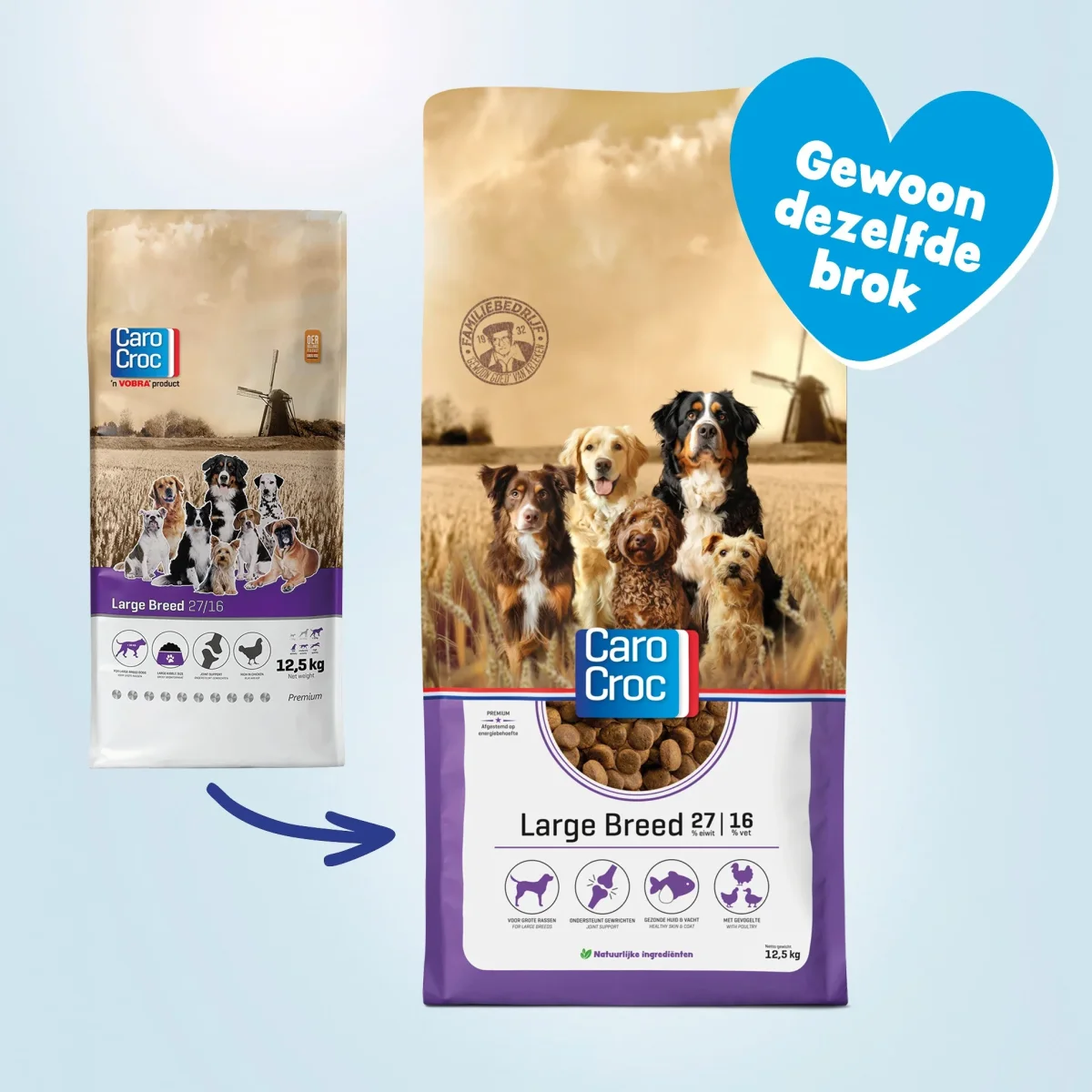 Honden van grote rassen schrokken over het algemeen vaker en dat vergroot de kans op maagkanteling. CaroCroc Large Breed is een extra grote brok van 25 mm. Zo wordt het schrokgedrag van jouw viervoeter verminderd. De grote en vaak krachtige lichamen van grote honden zijn ook gevoeliger voor gewrichtsslijtage. De bestanddelen van de brokken zorgen voor een goede ondersteuning van de botten en het kraakbeen. Hiernaast bevat CaroCroc Large Breed een optimale omega-3 en -6 verhouding, wat zorgt voor een stralende huid en vacht.