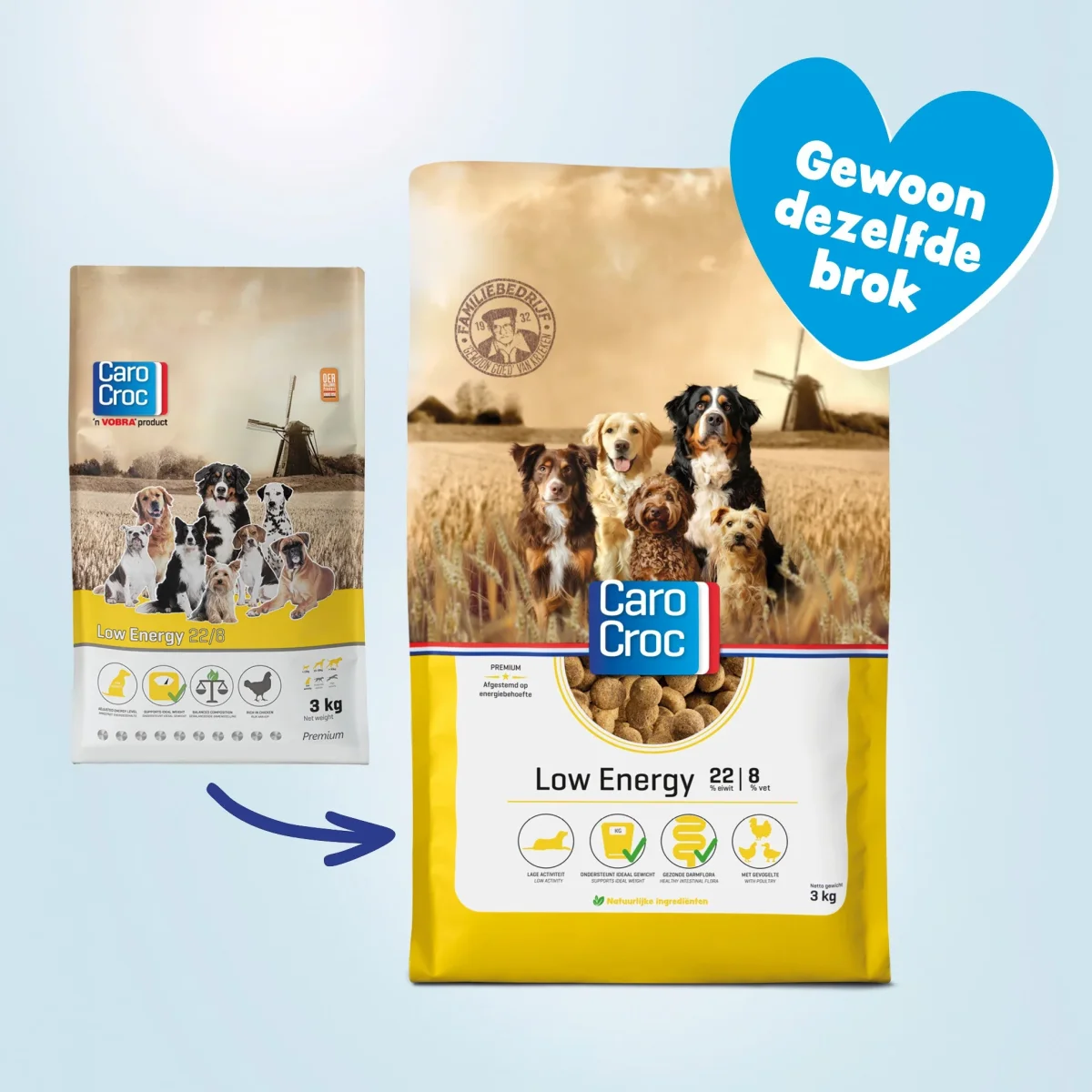 CaroCroc Low Energy is een brok voor volwassen honden met relatief weinig lichamelijke inspanning (minder dan één uur beweging per dag), honden die last hebben van of neigen naar overgewicht (bijvoorbeeld Labrador en Golden Retriever) of gecastreerd/gesteriliseerd zijn.