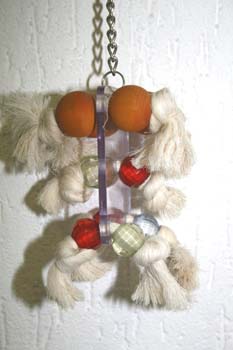 Speelgoed voor papegaai en parkiet. “Eve parkietenspeelgoed “”Funplate””. Een acryl fun plaat met geknoopt touw en houten balletjes ca. 7×20 cm hoog”