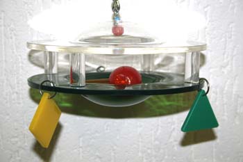 Speelgoed voor papegaai en parkiet. Ufo met ingesloten bewegende Spoetnik. kom ik daar nu aan? ca. 21,5 cm. doorsnee.