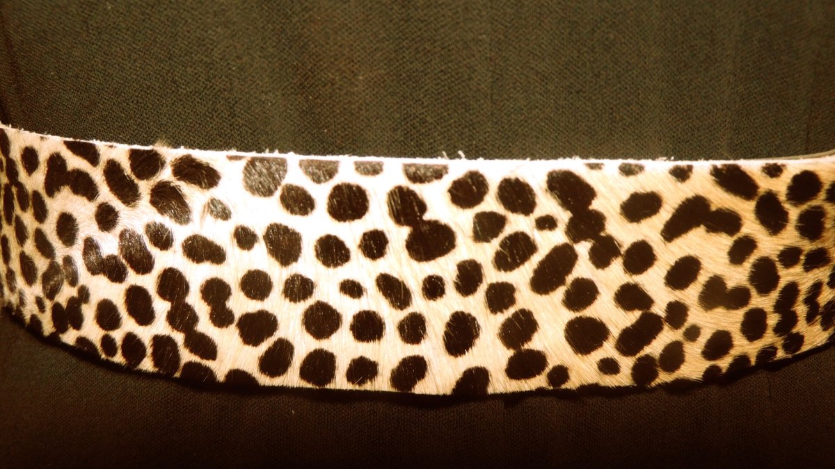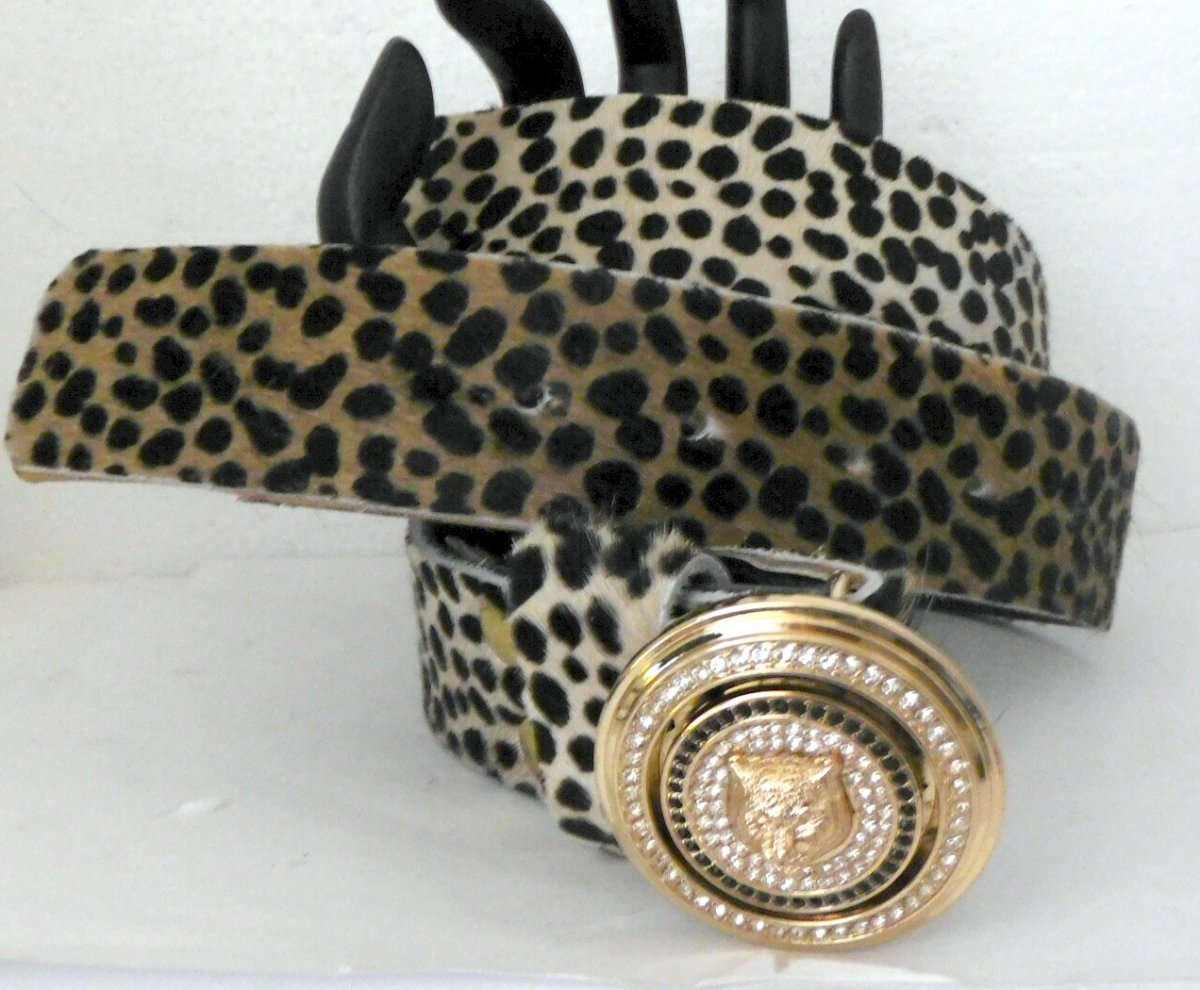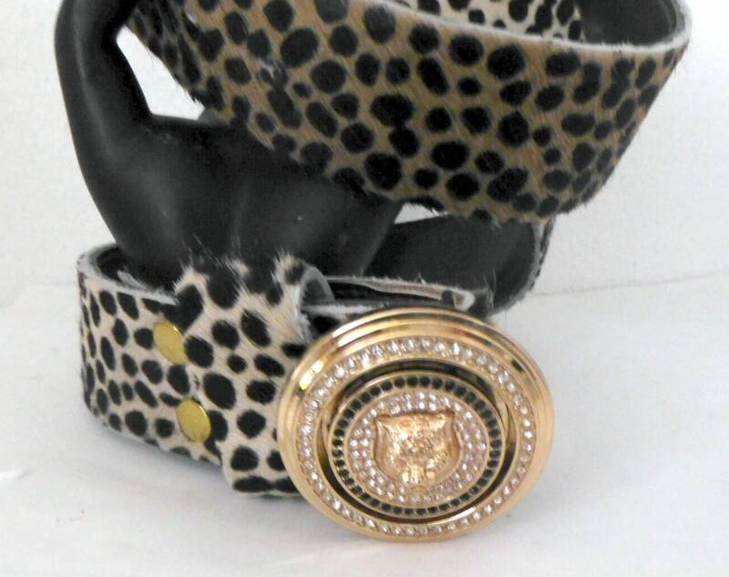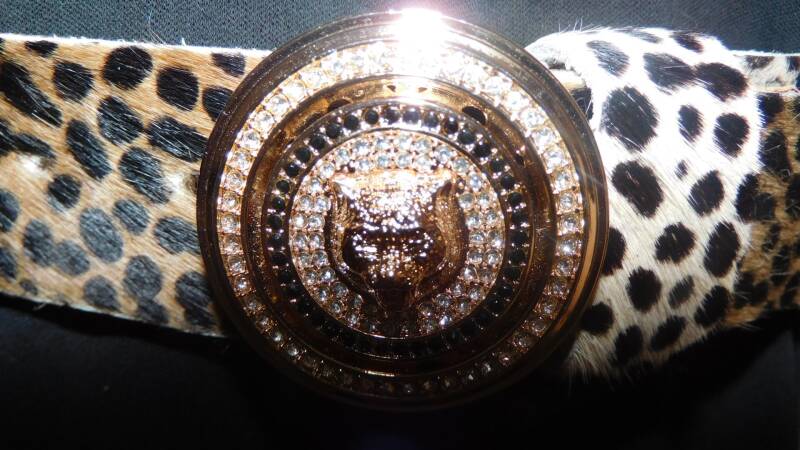 Gesp is rond,goudkleurig met tijgerkop , maat en zwarte en witte zirconia’s
