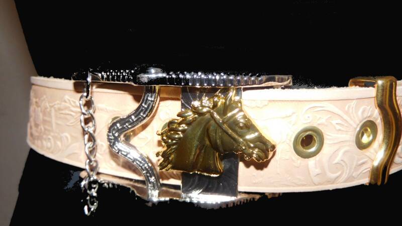Gesp is zilverkleurig, met een gouden paardenhoofd